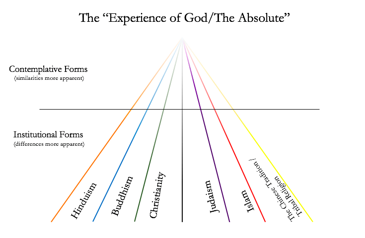 This representation, while mundane and imperfect, as all metaphors are, is generally a faithful and apt analogy of the perennial philosophy in its relation to the religions that serve for its incubation. The base camps and the various overland approaches to them are humanity in its multiplicity. The main approaches and routes up the mountain are akin to the major religions. The unified view that sees the singularity in multiplicity, the oneness in diversity, like the summiteer on the mountain summit, is the perennial philosophy.