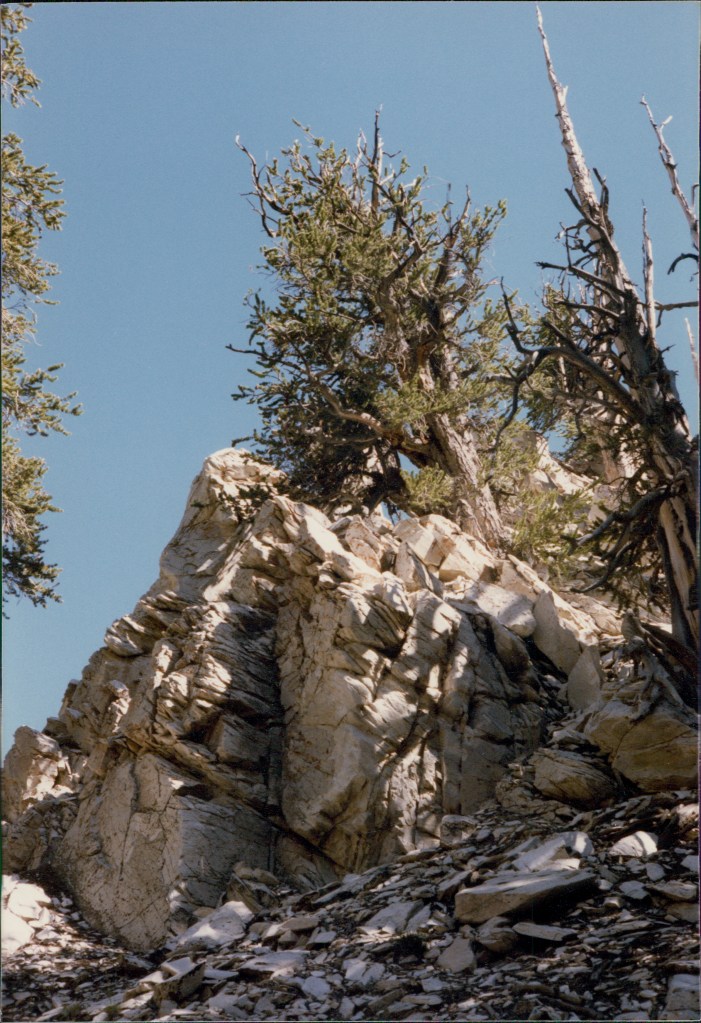 This basin, Cottonwood Basin, sits below the 12,000 foot crest of the range, just north of the Patriarch grove of bristlecone pines, where trees that were saplings during Christ’s life now mature into middle age. Here sagebrush, pinyon pines, bristlecones, and granitic outcrops coalesce into a pleasing patchwork of open flats and rolling wooded hummocks. Cottonwood Basin is the only place in the Whites where the taut and austere lines of an arid, fault-block mountain range yield to the undulating arcs of a serene, almost pastoral landscape. It seems a fine and appropriate place to lay down a burden.